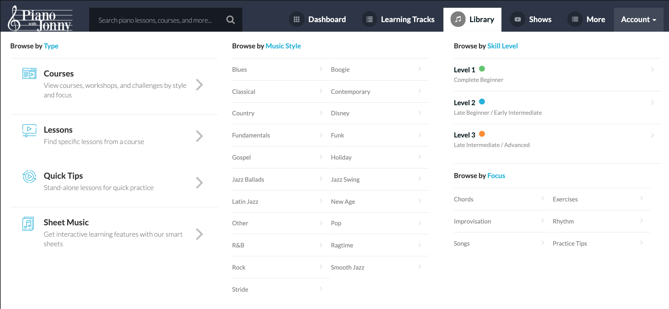 - Blues, Boogie, Classical, Contemporary, Country, Disney, Fundamentals, Funk, Gospel, Holiday, Jazz Ballads, Jazz Swing, Latin Jazz, New Age, Pop, R&B, Ragtime, Rock, Smooth Jazz, Stride