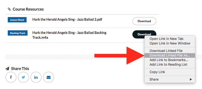If you are using Safari, you can download the backing tracks directly to your device by right-clicking the download button, then selecting "download linked file as..."